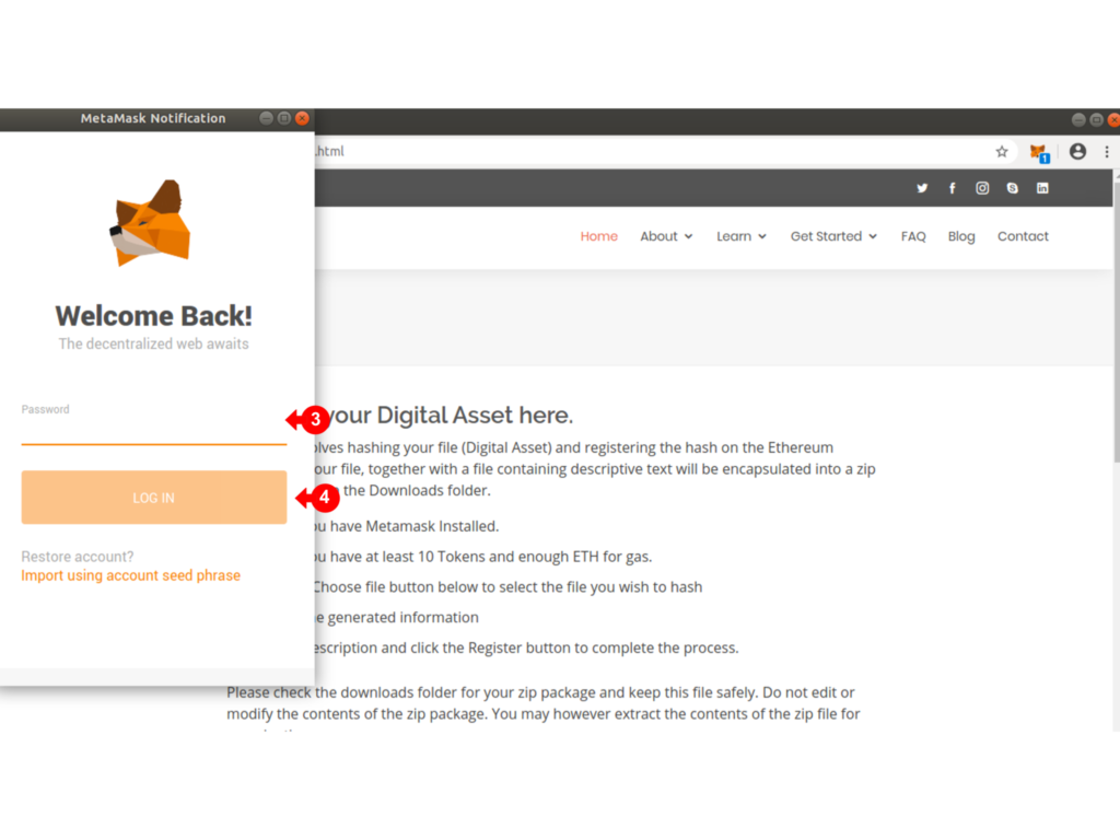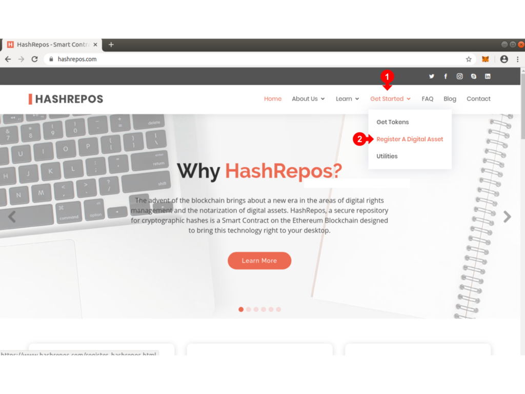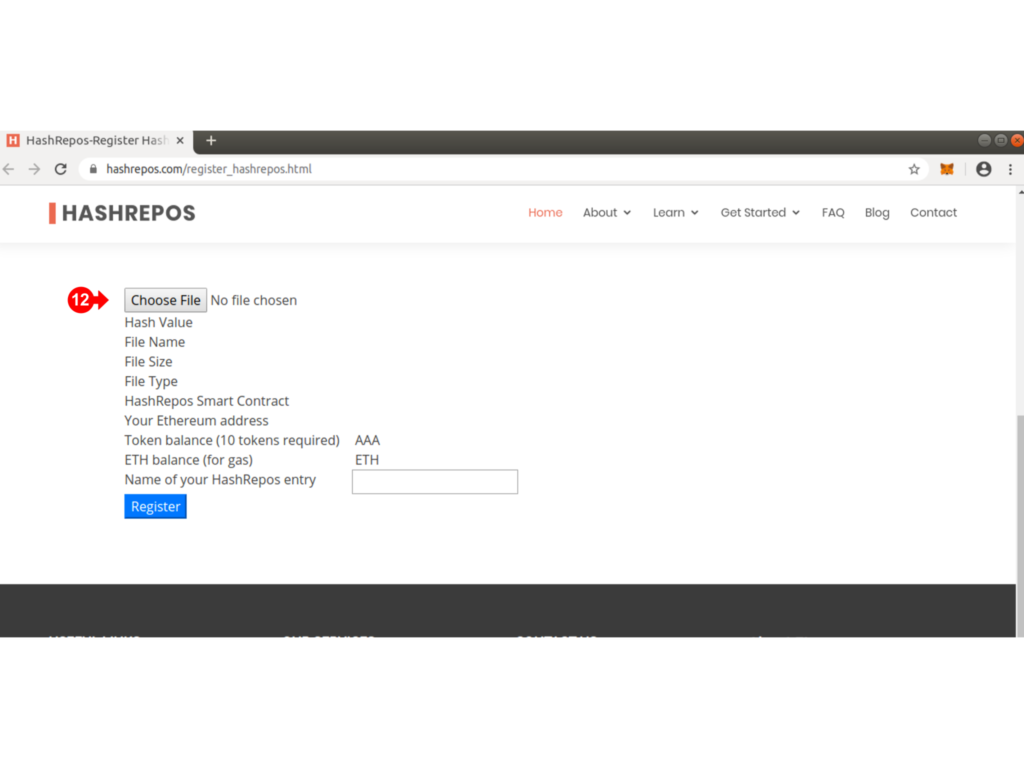 Once you have your Metamask Wallet set up with some ETH, you are ready to use HashRepos to register a hash of your file.