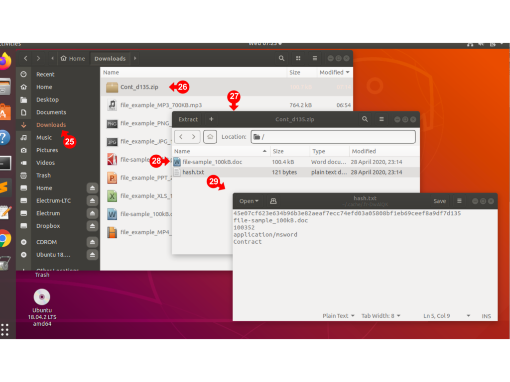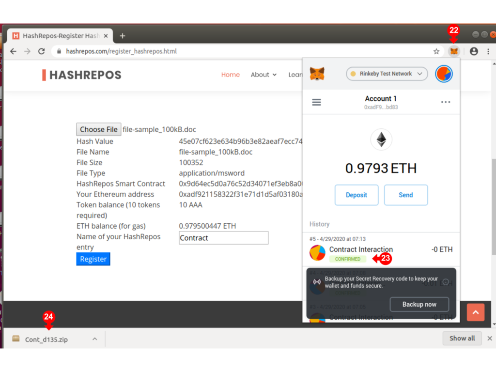 Note that a zip file (24) will be placed in the Downloads folder. The name of the zip file will be the first 4 characters of your file description combined with the last 4 characters of the hash. You should keep this package securely as it will also preserve a copy of your file.